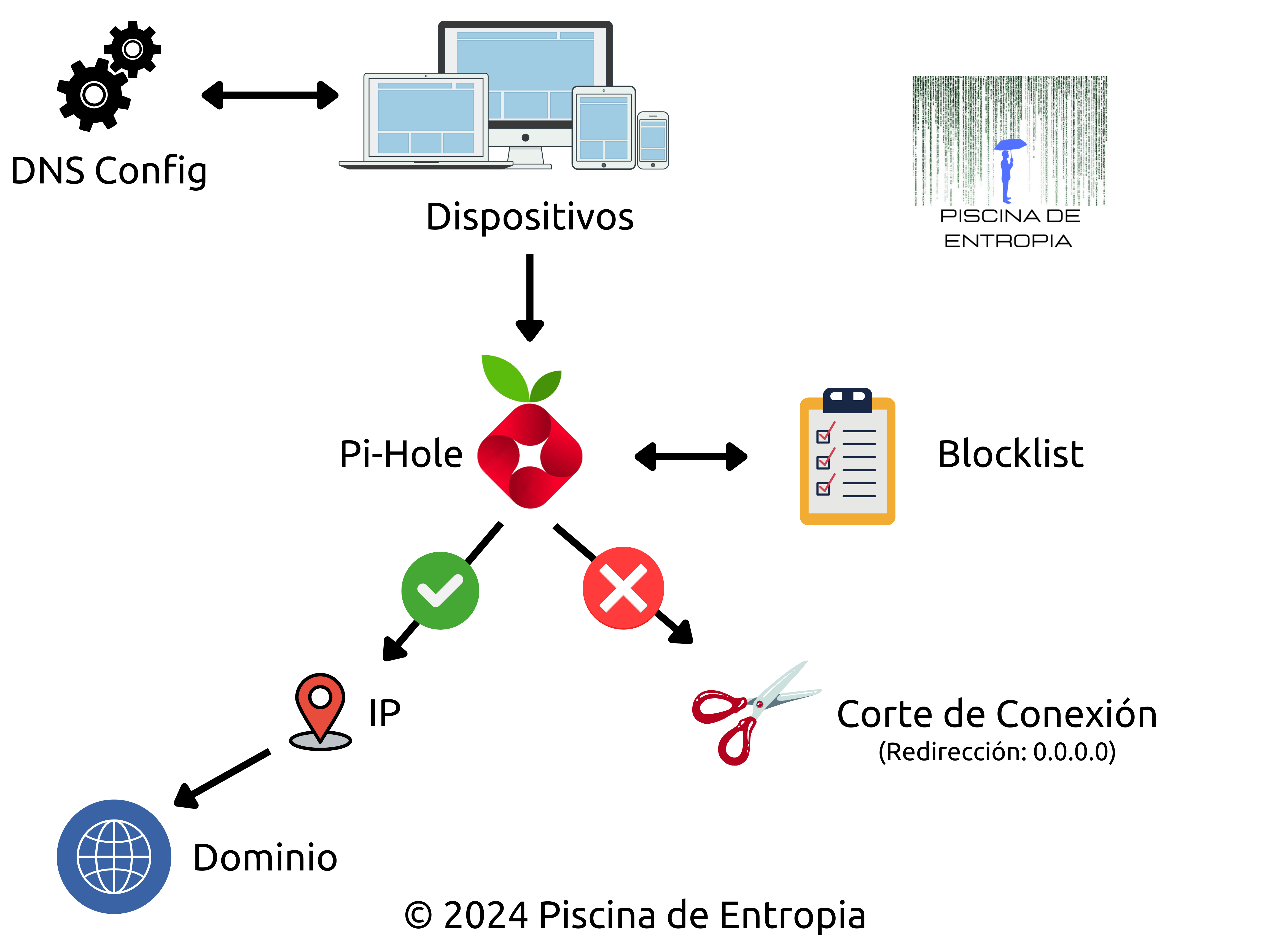 El usuario conecta los diferentes dispositivos que quiere que reciban la protección de Pi-Hole®, mediante los ajustes de red cambiando la opción DNS a la dirección IP del equipo que esta ejecutando Pi-hole®. Y Pi-hole® lo que hace es recibir todas las peticiones de conexion del dispositivo a los diferentes dominios, filtrando estas mediante las listas y reglas establecidas en los ajustes (que trataremos más adelante), en caso de que la petición sea valida la dejara pasar (devolvera al dispositivo la ip del servidor que ha solicitado) y en caso contrario "cortara" la conexión para que el dispositivo no se pueda conectar a ese dominio (devolverá la IP 0.0.0.0 que no es una IP valida).